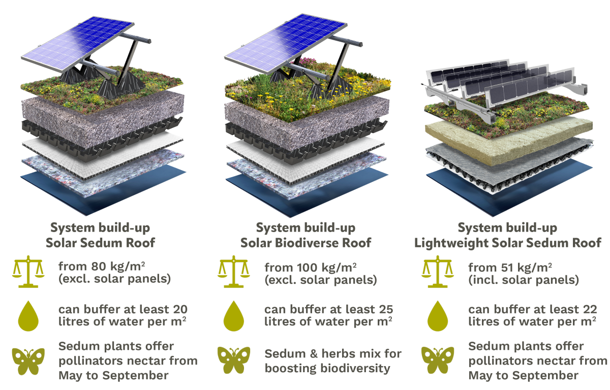 For roofs with a higher load-bearing capacity (80-100 kg/m²), choose the Solar Sedum Roof or Solar Biodiverse Roof. These systems consist of a green roof combined with a universal support, the Sempergreen Solar Stand, on which almost any type of solar panel can be placed.